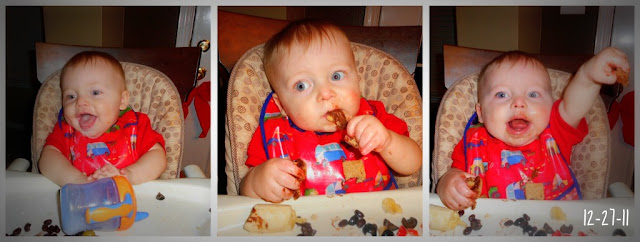 I hope everyone had a very merry Christmas!! We had a wonderful Christmas at our house. We were lucky enough to have Mark's family and My family here! It was fantastic to let everyone experience Evan's first Christmas with us. He, of course, was not too interested in his presents. He ripped open ONE of his presents and took a few bows off. He loved walking around in our wrapping paper mess. It was a Christmas obstacle course!